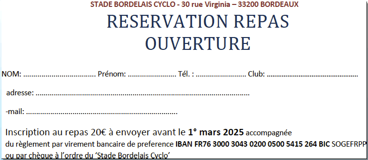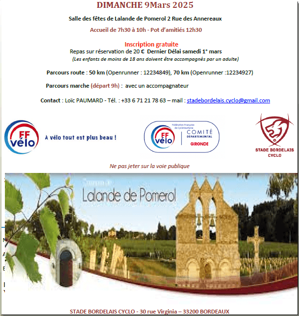 Amis (es) Cyclos et CyclotesChers passionnés de cyclisme et amis du sport en plein air. C'est avec un grand enthousiasme que nous vous invitons à l'ouverture de la saison 2025 du CODEP 33. Venez célébrer ensemble avec le Stade Bordelais Cyclo le début d'une nouvelle année riche en découvertes et en convivialité. 9 mars 2025 à partir de 7 h 30 à la salle des fêtes de Lalande de Pomerol 2 Rue des Annereaux. Au programme de cette journée : 2 parcours vous sont proposés et un parcours marche avec accompagnateur. Une belle occasion de rencontrer les autres membres et découvrir les projets de saison 2025. Venez nombreux avec votre vélo, votre sourire et votre bonne humeur. Pensez à réserver votre repas de 20 € avant le 1° mars 2025. Recevez de la part du C/O Nos amitiés sportives Claude JOYEZ
